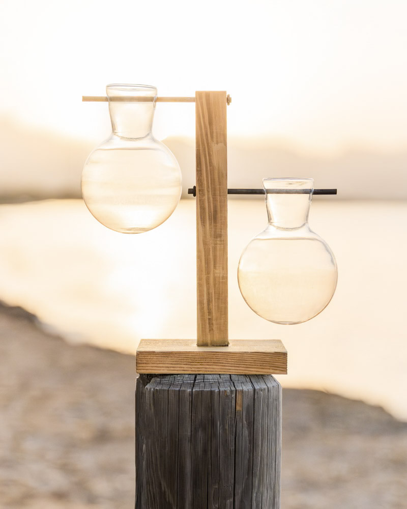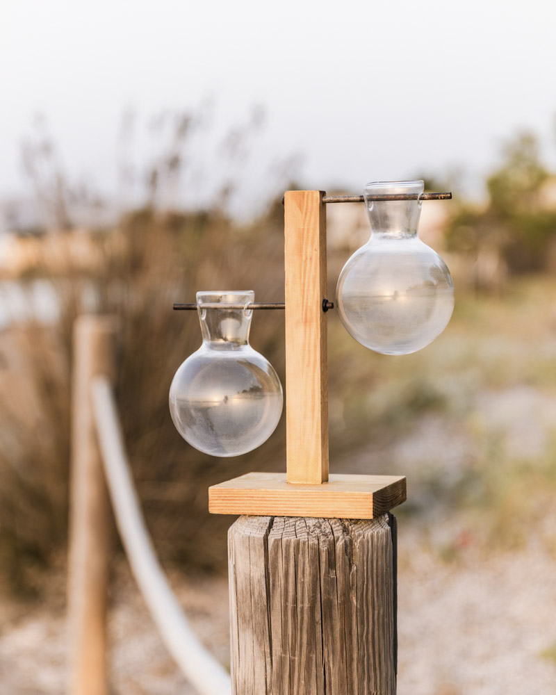 2 vasos de cristal, 1 base de madera y 2 enganches de metal